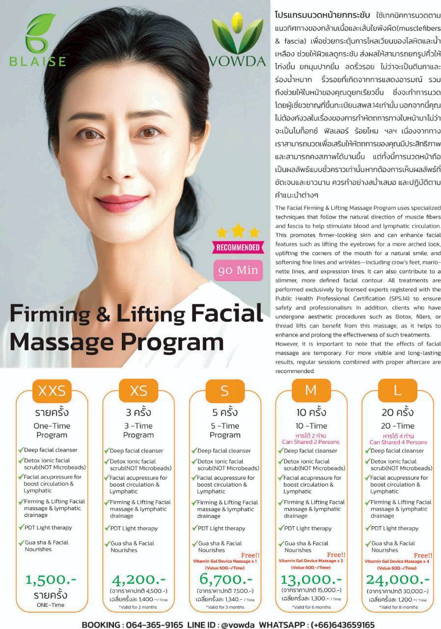 โปรแกรมนวดยกกระชับผิว ช่วยปรับรูปหน้าโดยใช้การนวดตามแนวกล้ามเนื้อ เป็นผลให้สามารถยกรูปคิ้วให้โก่งขึ้น ยกมุมปากยิ้ม ลดริ้วรอยไม่ว่าจะเป็นตีนกา ร่องน้ำหมาก และริ้วรอยที่เกิดจากการแสดงอารมณ์ รวมถึงช่วยให้หน้าเรียวขึ้นอีกด้วย ซึ่งจะทำการนวดโดยผู้เชี่ยวชาญที่ขึ้นทะเบียน สพส.14 นอกจากนี้คุณไม่ต้องกังวลในเรื่องของการทำหัตถการทางใบหน้ามา ไม่ว่าจะเป็นโบท็อกซ์ ฟิลเลอร์ ร้อยไหม ฯลฯ เนื่องจากทางเราสามารถนวดเพื่อเสริมให้หัตถการของคุณมีประสิทธิภาพและคงสภาพได้นานขึ้น แต่ทั้งนี้การนวดนั้นถือเป็นผลลัพธ์เพียงชั่วคราว หากจะเห็นผลลัพธ์ที่ชัดเจนและยาวนานควรทำอย่างสม่ำเสมอ และปฏิบัติตามคำแนะนำต่างๆ