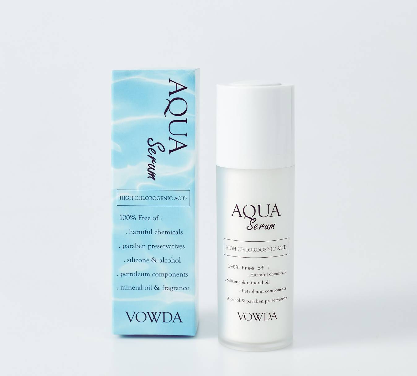 Vowda Aqua Serumมีจุดเด่นตรงสารสกัดจากเมล็ดกาแฟดิบ โดยเฉพาะสาร chlorogenic acid ซึ่งบริษัทฯใช้กระบวนการและเทคนิคเฉพาะ ทำให้ได้ chlorogenic acid ที่มีความเสถียร อนุภาคเล็ก และสกัดได้ปริมาณมากเมื่อเทียบกับการสกัดแบบทั่วไป โดยเมื่อนำสารสกัดที่ได้มาผสมลงใน natural base serum สูตรเฉพาะที่ผสมเซราไมด์3 ซึ่งจะช่วยลดการอักเสบของผิว เหมาะสำหรับผู้ที่มีปัญหาผิวแพ้ง่าย เป็นผื่นคัน เป็นสิวผดและสิวอักเสบ เมื่อใช้อย่างต่อเนื่อง ผิวจะแข็งแรงขึ้น ไม่ไวต่อสภาวะแวดล้อม รวมถึงผิวจะค่อยๆเรียบเนียน จุดด่างดำ และริ้วรอยตื้นจางลง นอกจากนี้ยังช่วยกระตุ้นการไหลเวียนของเลือด (blood circulation)