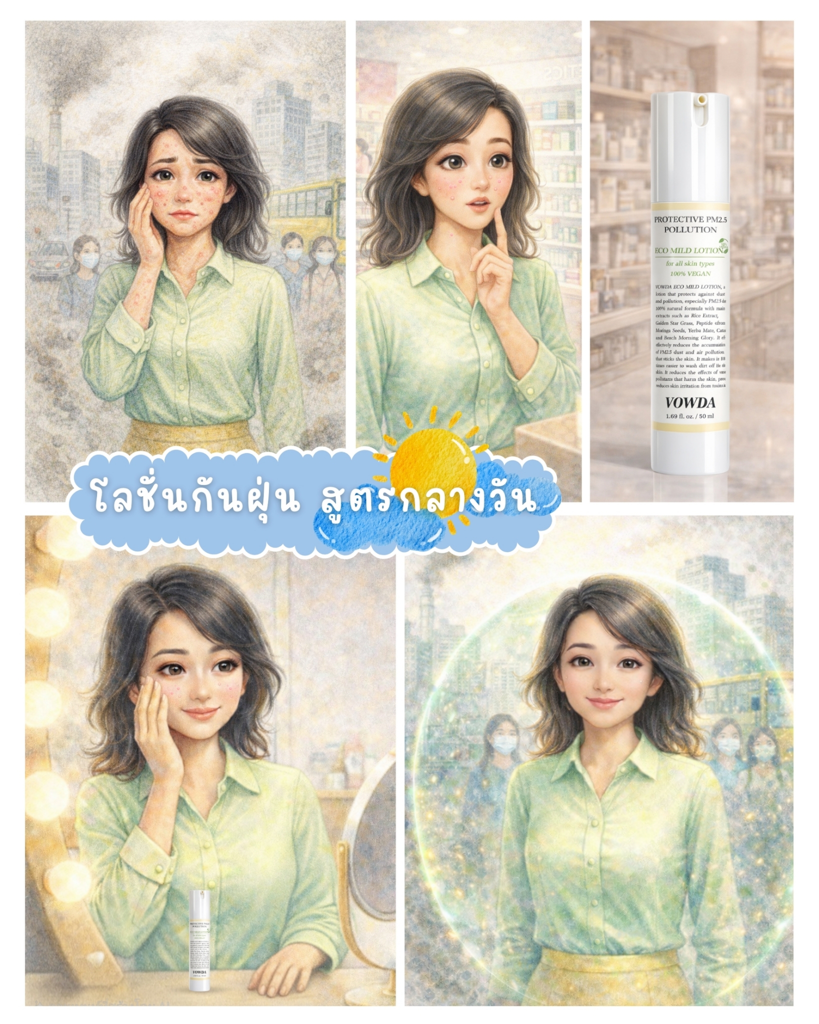 VOWDA ECO MILD LOTION, a lotion that protects against dust and pollution, especially PM2.5 dust. 100% natural formula with main extracts such as Rice Extract, Golden Star Grass, Peptide from Moringa Seeds, Yerba Mate, Cactus and Beach Morning Glory. It effectively reduces the accumulation of PM2.5 dust and air pollution that sticks to the skin. It makes it 8 times easier to wash dirt off the skin. It reduces the effects of various pollutants that harm the skin, prevents premature wrinkles and dull skin, and reduces skin irritation from toxins in the air.