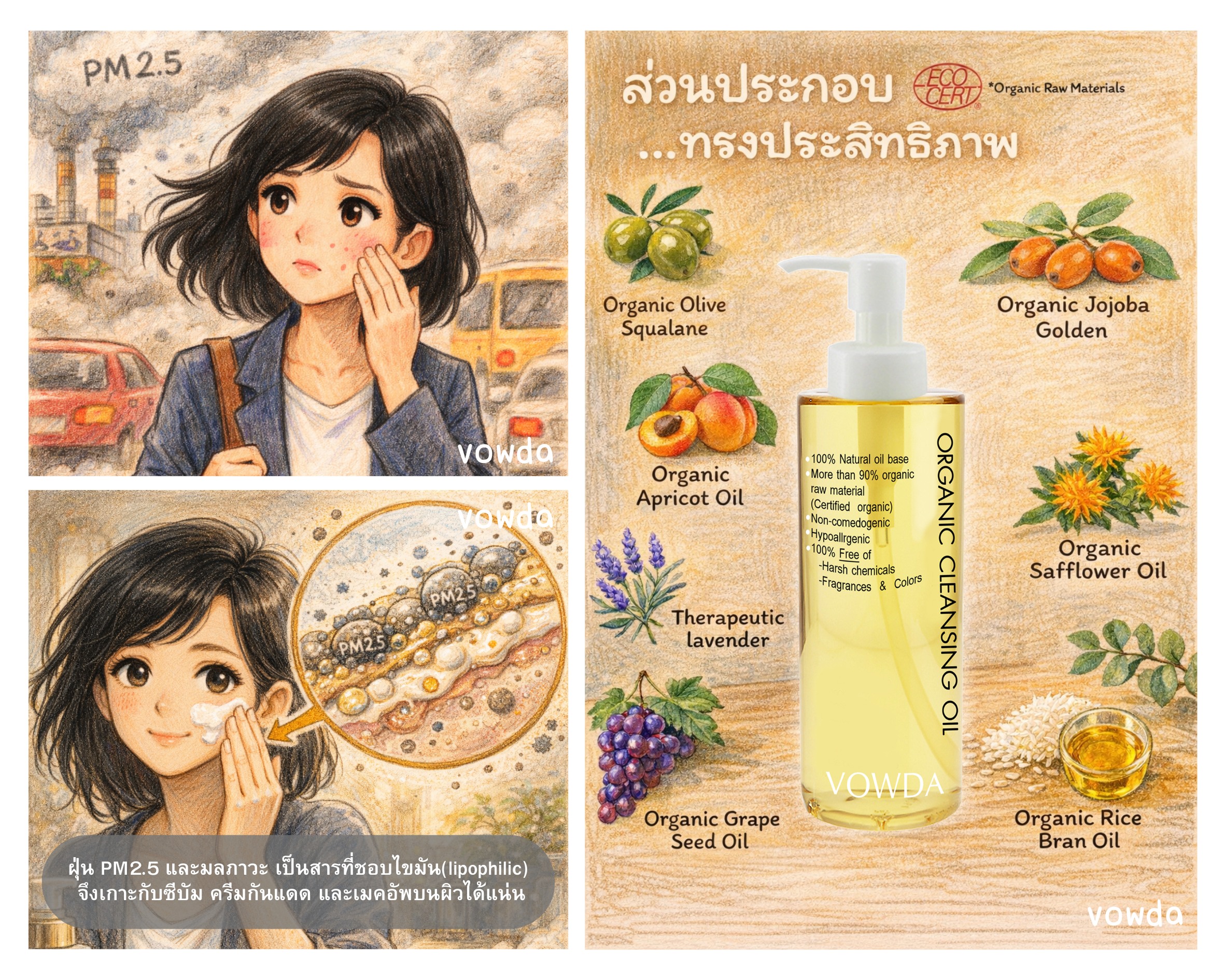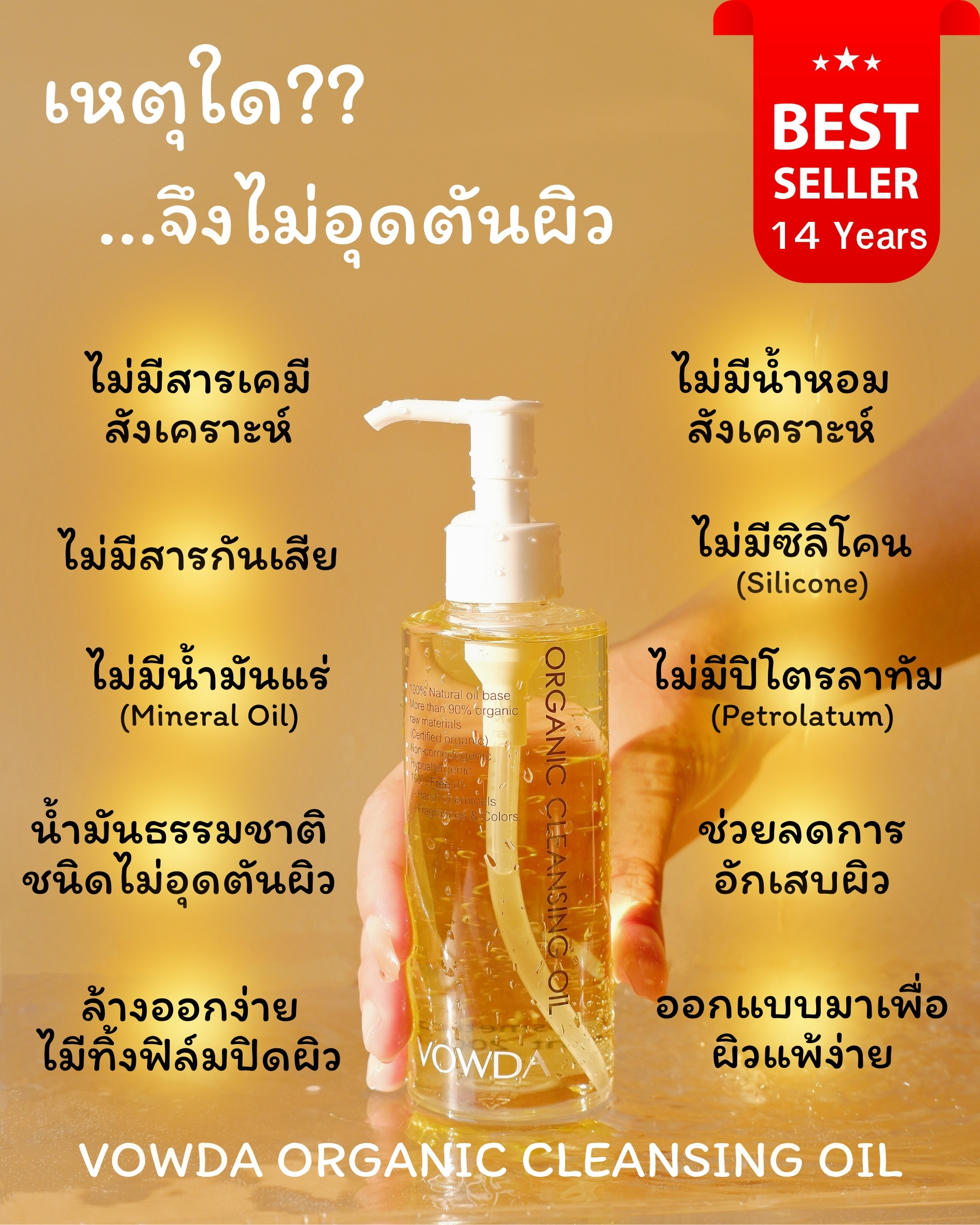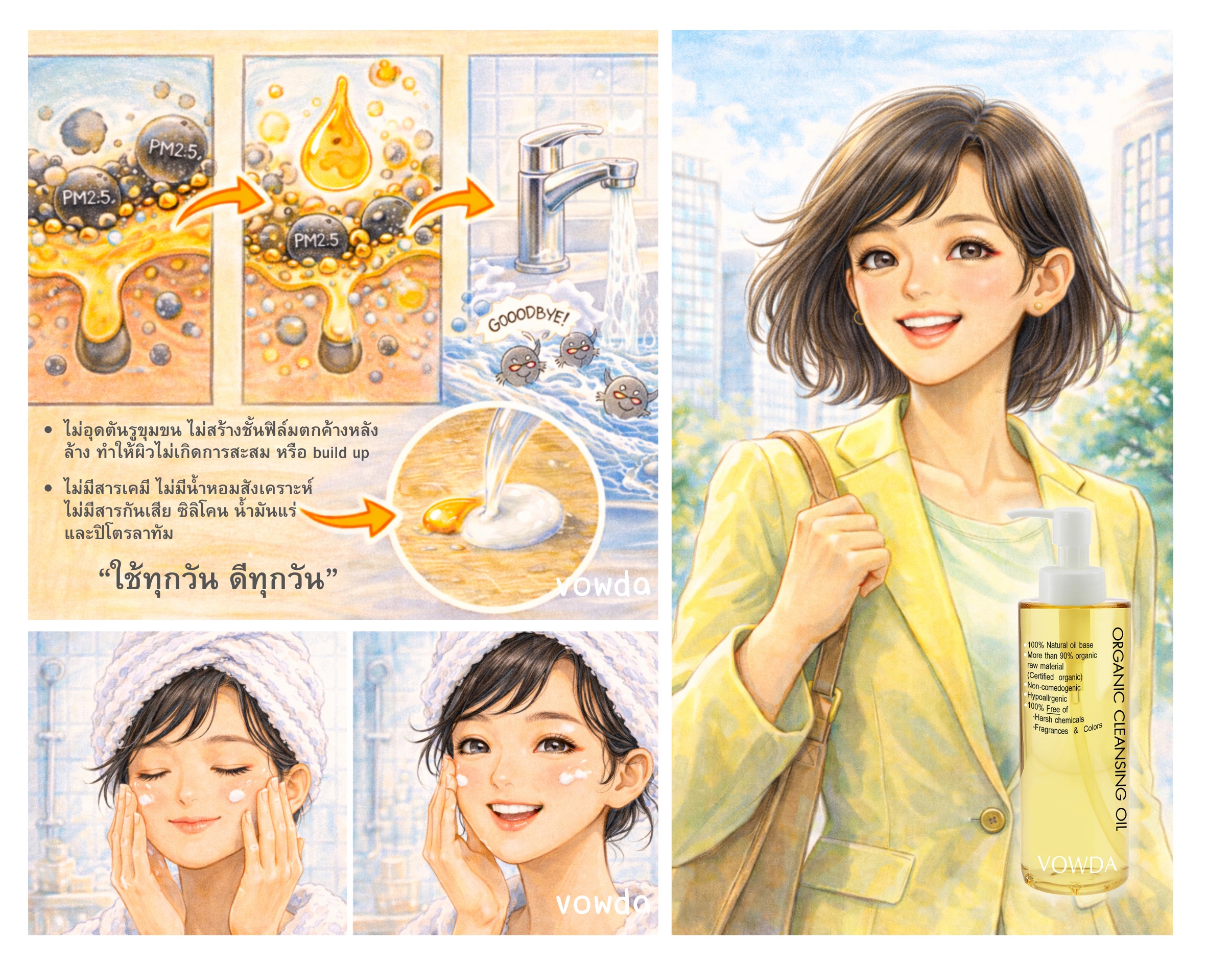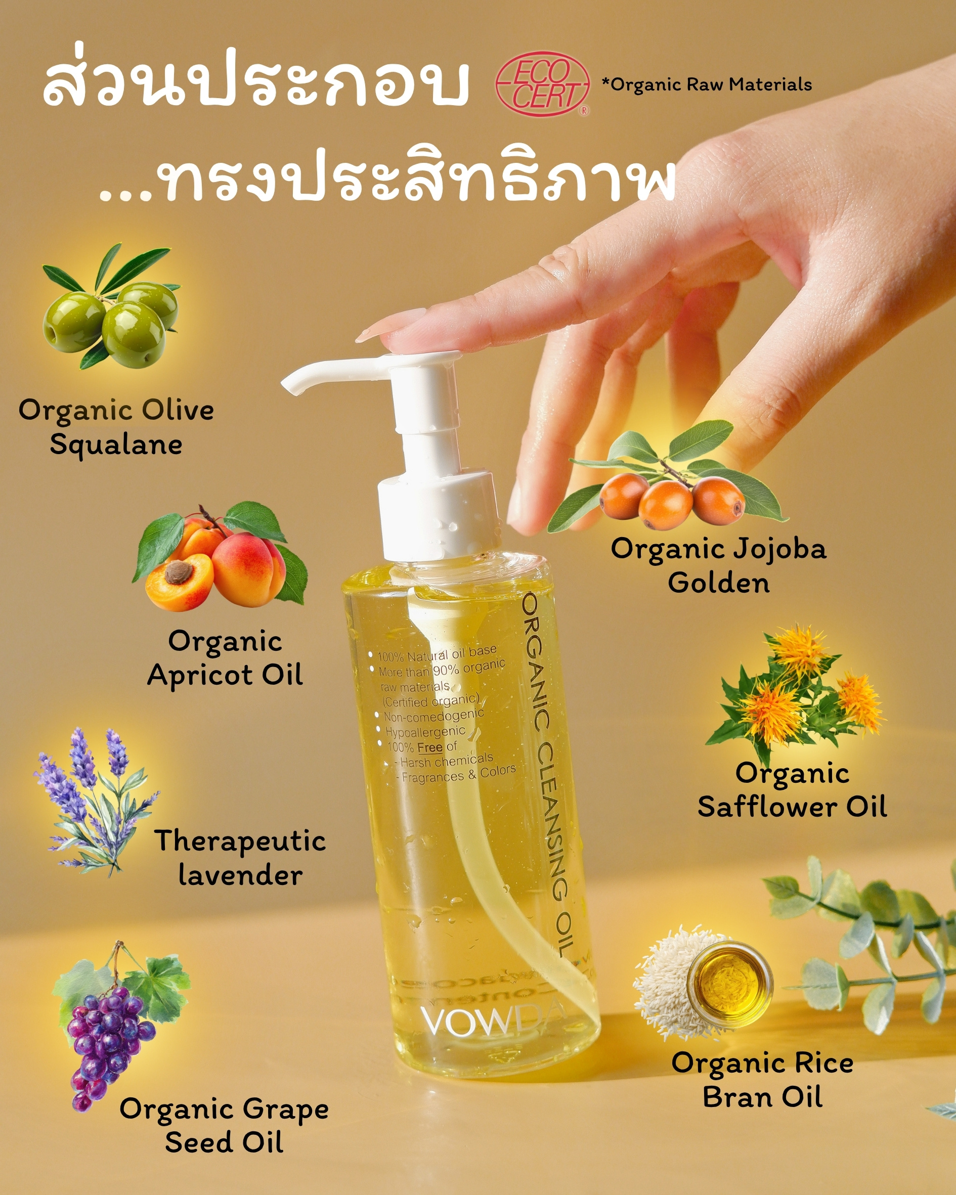 VOWDA CLEANSING OIL,Organic Raw materials From Ecocert Grade โดยมี Organic Squalane จากผลมะกอก เป็นส่วนประกอบหลัก ซึ่งมีคุณสมบัติคล้ายคลึงกับน้ำมันหล่อเลี้ยงผิว จึงเข้ากับผิวได้ดี ไม่ทำให้อุดตัน ใช้ได้กับทุกสภาพผิว แม้ผิวมัน
