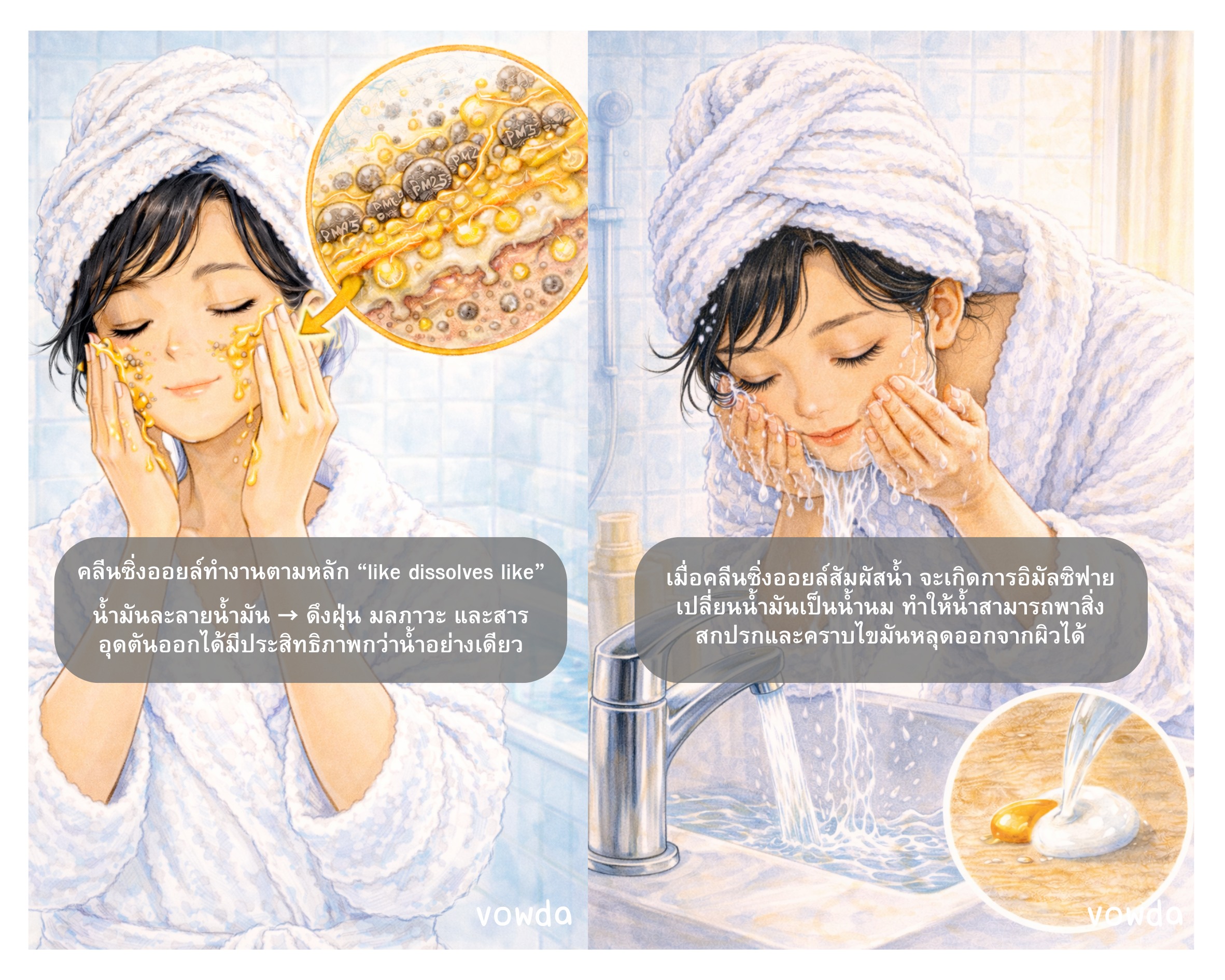 เนื่องจากผิวหน้าของเรามีน้ำมันหล่อเลี้ยงผิวเป็นส่วนประกอบหลัก ประกอบกับครีมบำรุงผิว ครีมกันแดด หรือเครื่องสำอางต่างๆเป็นน้ำมัน จึงต้องใช้ผลิตภัณฑ์ล้างหน้าที่สามารถละลายน้ำมันได้ เนื่องจากการใช้น้ำเปล่าและสบู่นั้นไม่เพียงพอ จึงอาจเป็นต้นเหตุของสิวอุดตันและริ้วรอยก่อนไวได้ วาวด้าคลีนซิ่งออยล์ สามารถตอบโจทย์ของปัญหาการล้างหน้าได้อย่างถูกต้อง เนื่องจากหลังจากนวดวนคลีนซิ่งออยล์ลงบนผิวหน้า จะสามารถละลายเอาสิ่งสกปรก เครื่องสำอาง และน้ำมันส่วนเกินบนผิวหน้าให้ลายลายออกมาได้ จากนั้นเมื่อล้างน้ำสะอาด น้ำมันจะเปลี่ยนเป็นน้ำนมและละลายเอาสิ่งสกปรกต่างๆออกไปตามน้ำ โดยไม่จำเป็นต้องใช้สำลีหรือกระดาษเช็ดหน้าเช็ดออก จึงลดการเสียดสีผิวหน้าได้เป็นอย่างดี ทำให้ผิวหน้าสะอาดพร้อมเต็มที่สำหรับการบำรุงในขั้นตอนต่อไป
