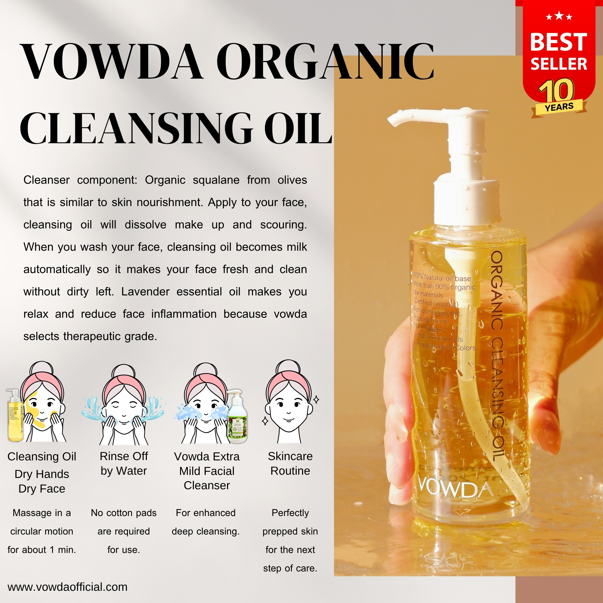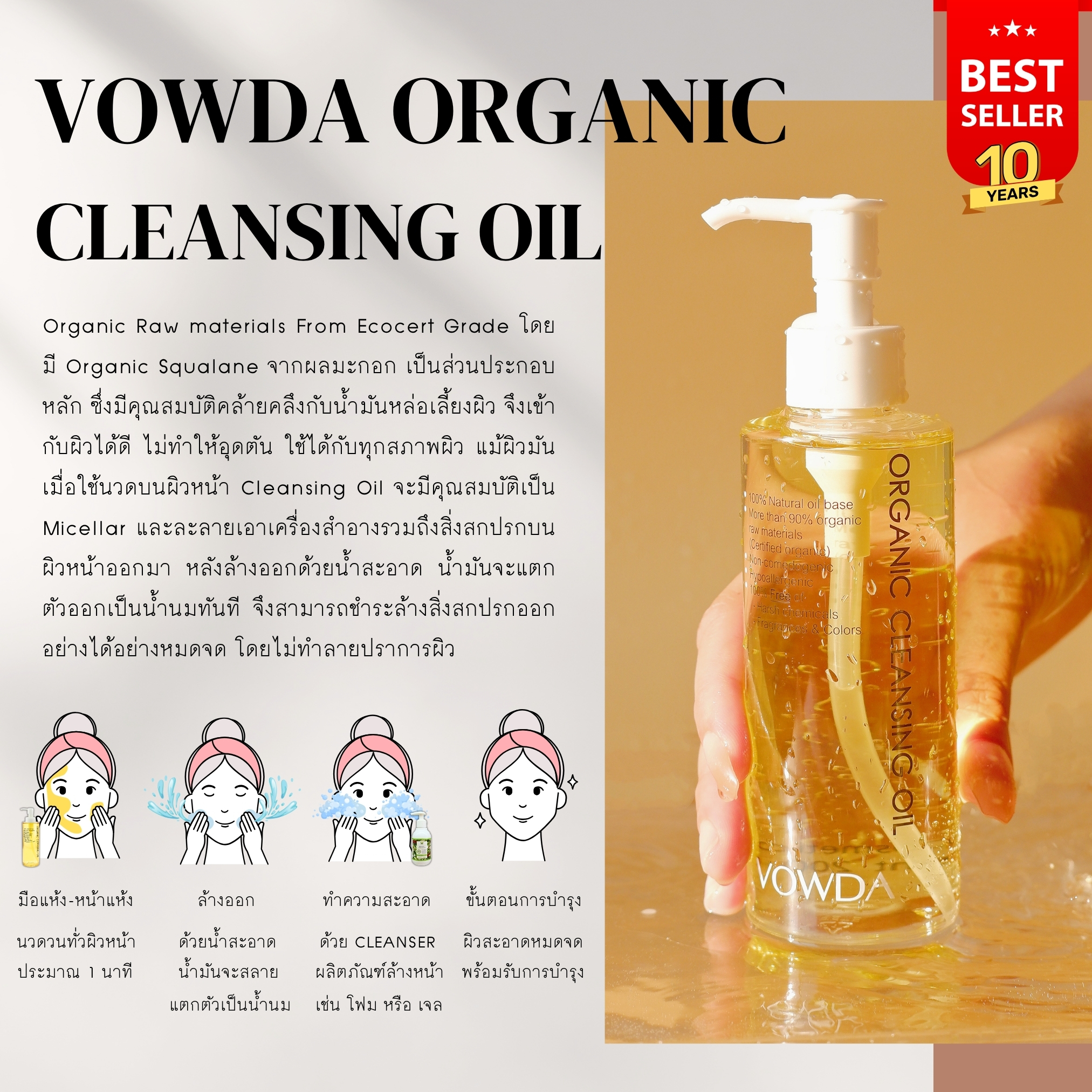 Organic Raw materials From Ecocert Grade โดยมี Organic Squalane จากผลมะกอก เป็นส่วนประกอบหลัก ซึ่งมีคุณสมบัติคล้ายคลึงกับน้ำมันหล่อเลี้ยงผิว จึงเข้ากับผิวได้ดี ไม่ทำให้อุดตัน ใช้ได้กับทุกสภาพผิว แม้ผิวมัน เมื่อใช้นวดบนผิวหน้า Cleansing Oil จะมีคุณสมบัติเป็น Micellar และละลายเอาเครื่องสำอางรวมถึงสิ่งสกปรกบนผิวหน้าออกมา หลังล้างออกด้วยน้ำสะอาด น้ำมันจะแตกตัวออกเป็นน้ำนมทันที จึงสามารถชำระล้างสิ่งสกปรกออกอย่างได้อย่างหมดจด โดยไม่ทำลายปราการผิว กลิ่นหอมอ่อนๆจากดอกลาเวนเดอร์ นอกจากช่วยให้ผ่อนคลาย ยังช่วยลดการอักเสบบนผิวหน้า เนื่องจาก VOWDA เลือกใช้เกรด Therapeutic